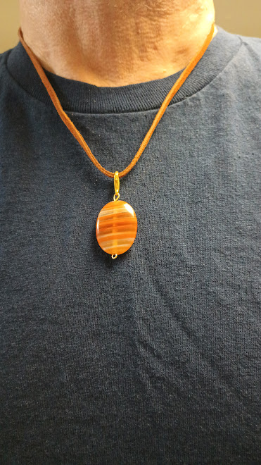 Sardonyx Necklace and 7 1/4 in Bracelet set. Sardonyx stone is 1 1/2 inch oval stone. The cord is suede, toggle closure. The set is 40.00.
