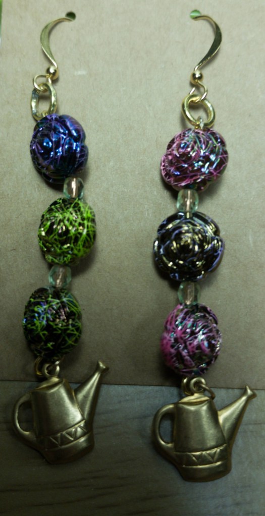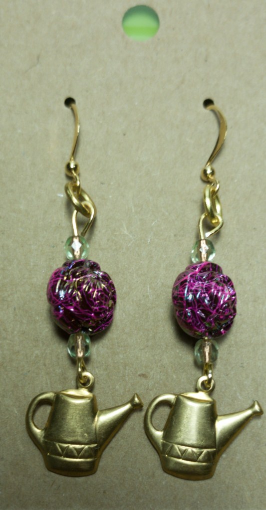 “Step into a blooming garden with these delightful ‘Garden of Roses’ earrings! Available in one, two, or three rose styles, each pair features intricate rose-patterned beads in shimmering hues, accented with gold-tone fish hooks and wire. The charming gold watering can charm adds a whimsical touch, perfect for garden lovers and romantics alike. Lightweight and beautifully detailed, these earrings are a stunning accessory for any outfit. Just $5.00 a pair—treat yourself or gift a touch of elegance and playfulness today!”
