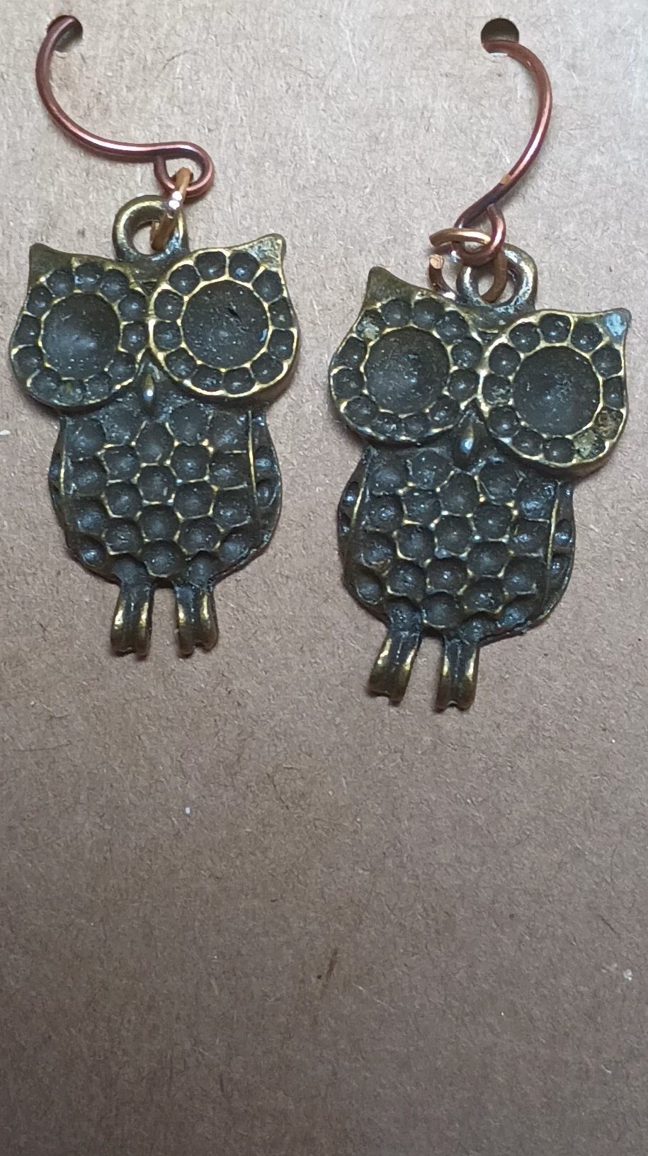 These earrings are bronze-toned owl-shaped charms with intricate patterns resembling feathers and large, stylized eyes. They hang from simple copper color ear hooks, creating a whimsical, nature-inspired design. Perfect for animal lovers and anyone who enjoys unique, rustic accessories.